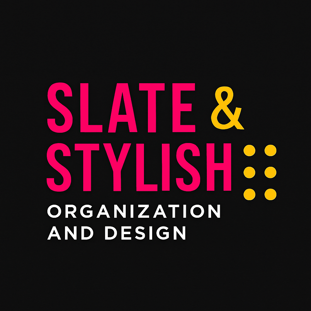 The Slate and Stylish: Organization and Design logo features bold, modern typography in vibrant magenta set against a black background, conveying confidence, creativity, and clarity. The ampersand and accent elements appear in gold, adding warmth and a sense of elevated design. To the right of the logo are six yellow dots arranged in a vertical pattern, representing a Braille cell. This element reflects a commitment to accessibility, inclusion, and literacy, honoring the importance of designing spaces—and experiences—that are usable and welcoming for everyone. Together, the logo balances style and function, mirroring the brand’s mission to create beautiful, practical systems that truly work for real life.